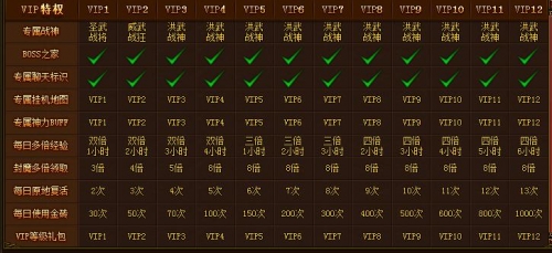 成为VIP可以获得丰厚的极品大礼包,更可享受专属战神、每日多倍经验及专属BOSS地图BOSS之家,升级打宝更容易!